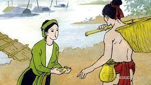 Một hôm có con gà vào bới bếp, chồng chợt thấy trong bọc xống áo của vợ có thoi vàng liền ném đuổi con gà. Chẳng ngờ quá tay, thỏi vàng văng xuống sông. Người vợ nhìn thấy kêu lên: